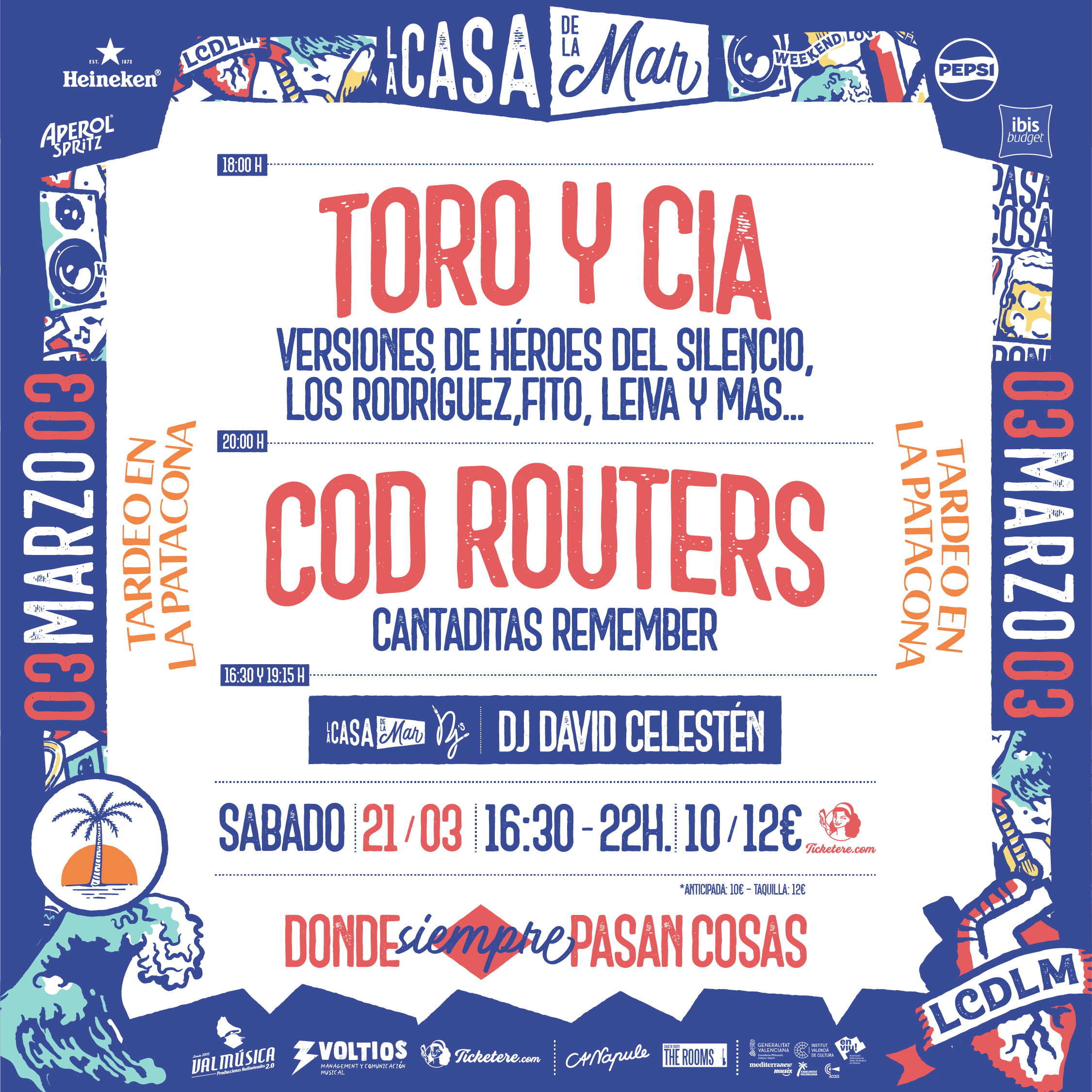16:30 DJ DAVID CELESTÉN 18:00 TORO & CIA: VERSIONES DE HÉROES DEL SILENCIO, LOS RODRÍGUEZ, FITO, LEIVA Y + 19:15 DJ DAVID CELESTÉN 20:00 COD ROUTERS